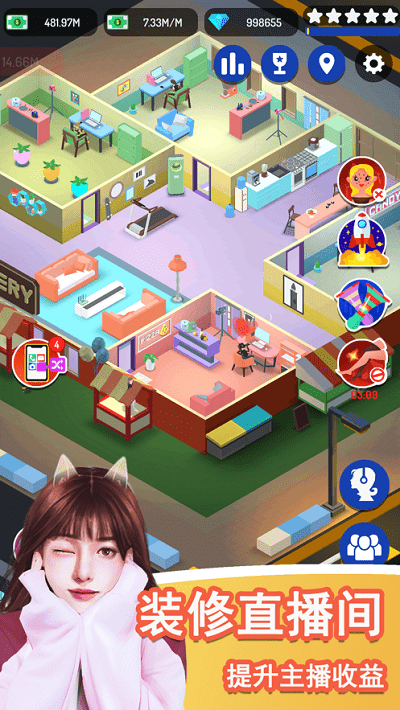 直播开始啦手机版在游戏中成为mcn老板,开启你的模拟经营之路吧,建设你的主播公司,在游戏中签约各种主播,根据不同的类型来挑选主播,建设各种直播间,在游戏中为她们定制主播路线,提升她们的能力来涨粉,非常多的玩法,赶紧来试试。