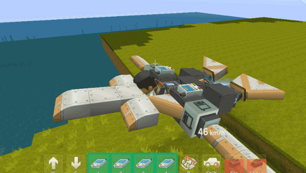 14、这样一个简易的飞机就制作完毕啦!生成载具后尝试一下,首先坐上飞机,按下推进按键: