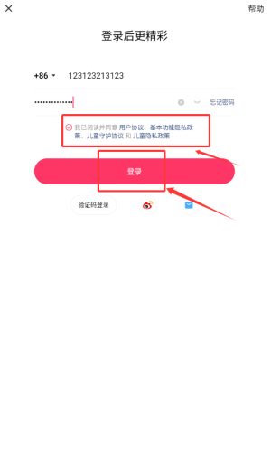2、输入手机号和密码,勾选协议后点击红框登录按钮。