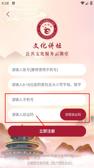 4、输入手机号,点击获取验证码并输入,点击立即注册,完成账号注册操作。