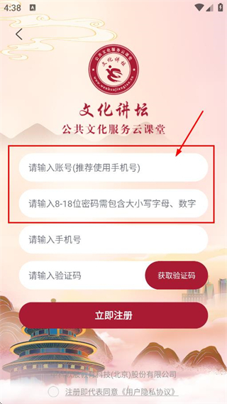 3、在账号注册页面,输入账号和8-18位包含大小写字母、数字的密码。