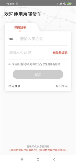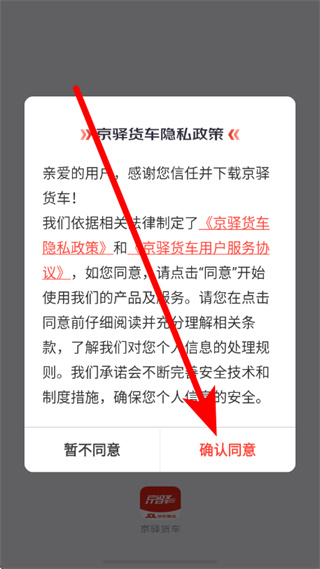 1、打开京驿货车,在隐私政策弹窗中,点击确认同意。