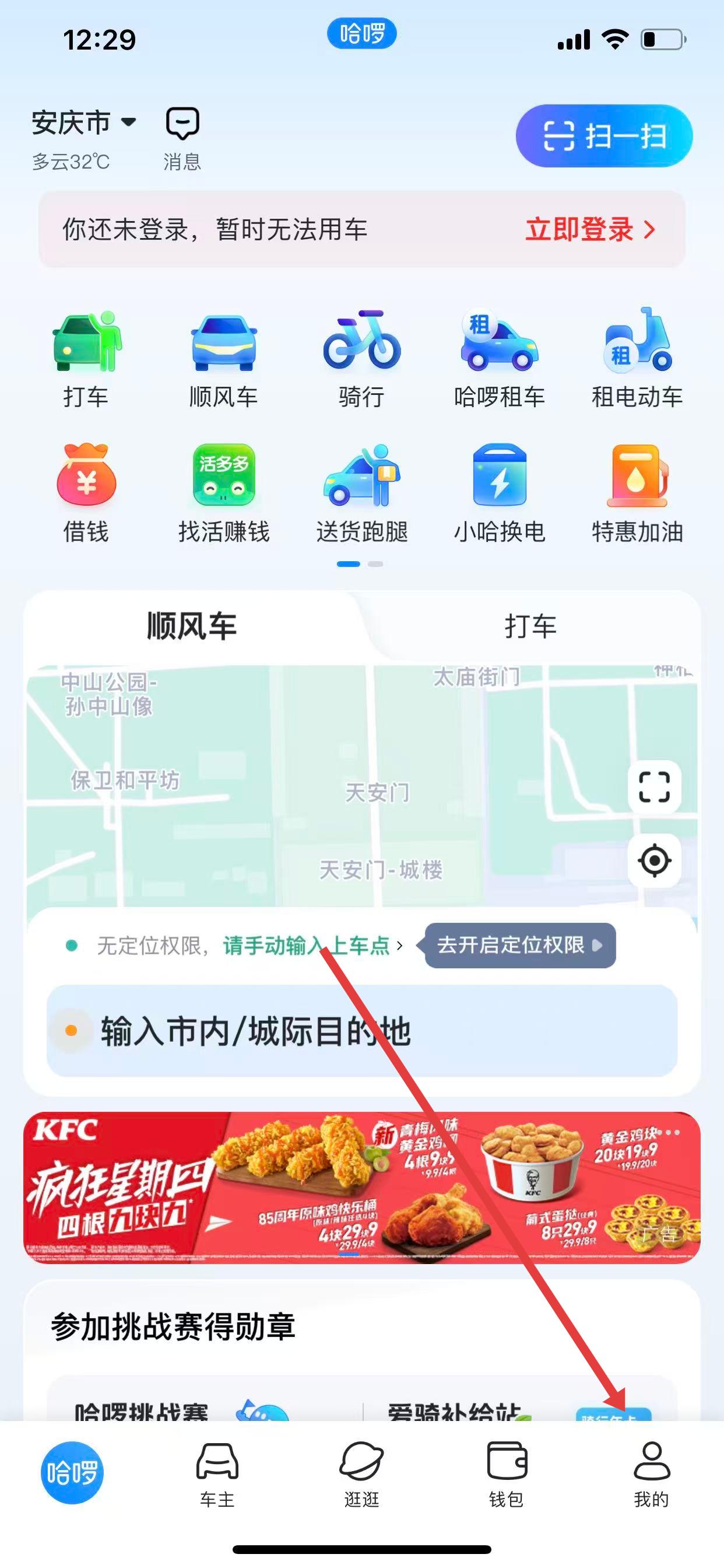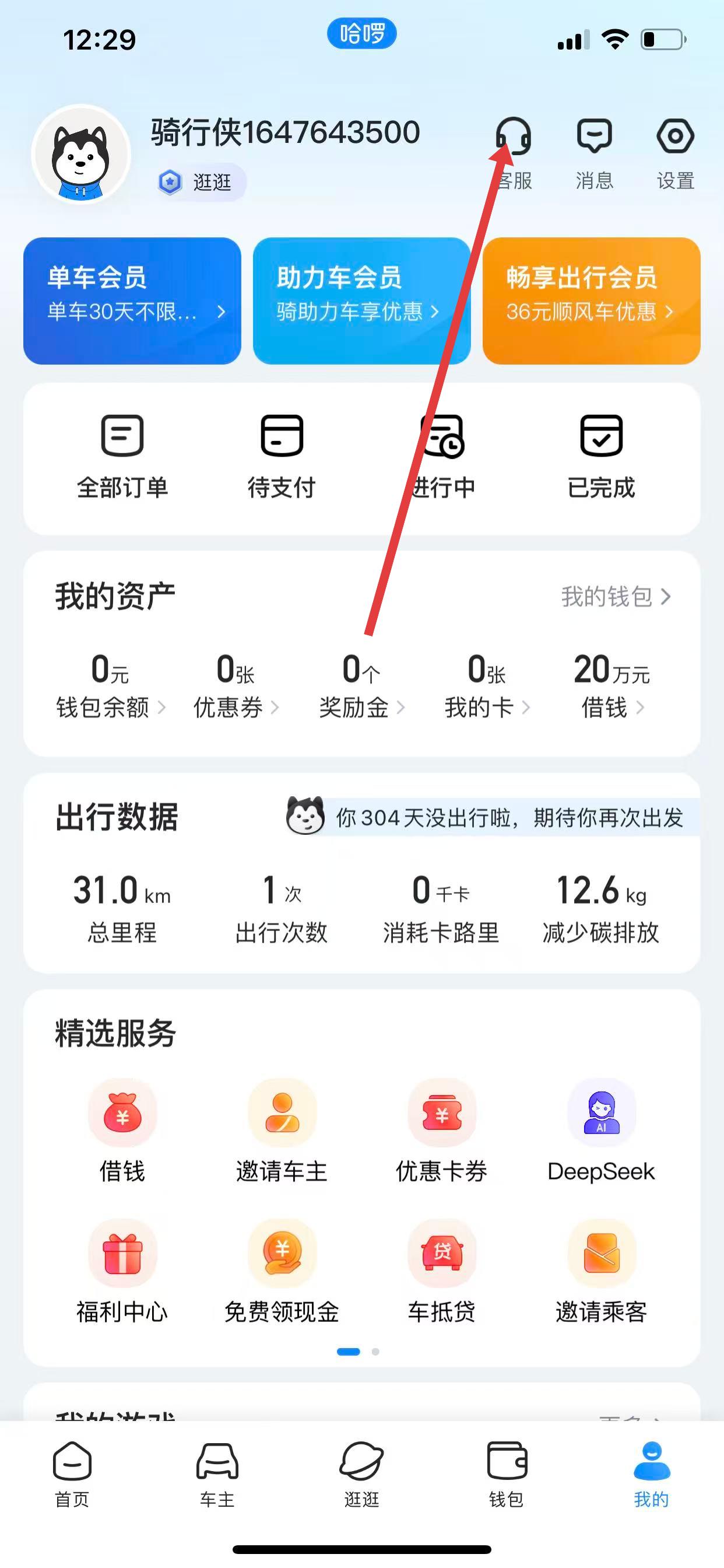 1、打开哈啰出行APP,点击屏幕右下角我的选项,进入个人中心页面。