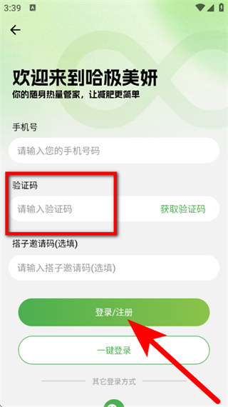 3、在登录注册页面,输入手机号码,点击获取验证码。