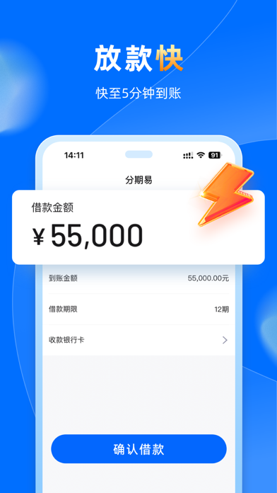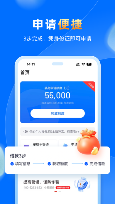 【产品介绍】 放款快:快速放款,现金借款成功后最快1分钟到账; 高额度:最高额度10万元; 息费透明:日利率0.03%起; 周期灵活:可分12期; 操作便捷:凭身份证、手机号线上完成申请;优化产品体验,修复已知问题