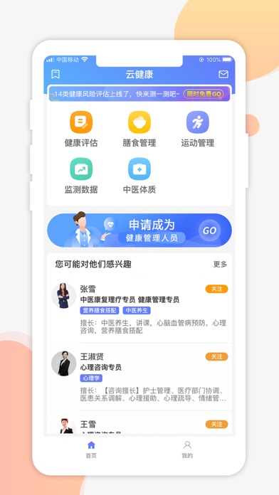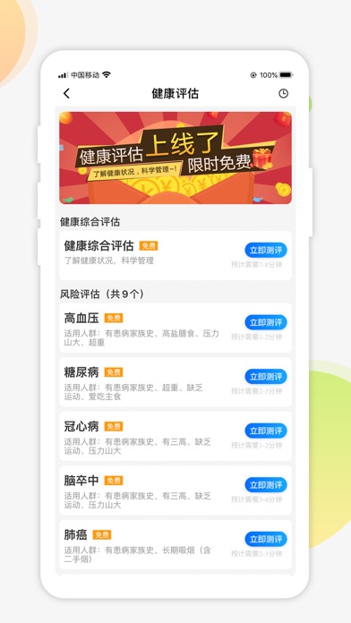 【健康评估】提供科学专业的健康评估,健康风险早知道。 【膳食管理】根据用户的健康风险评估和指标情况计算提供个性化膳食营养量化指导建议 【运动管理】根据用户的健康风险评估和指标情况计算提供个性化运动指导建议 【监测数据】记录血压、血糖、体重的身体健康数据,掌握指标变化趋势,随时随地进行查询 【中医体质】根据用户的健康评估,提供专业的身体调摄原则,并建议合适的环境起居 【免责声明】云健康所提供的健康方案仅供参考,不作为诊断和治疗的依据。用户若患有疾病、长期服药或其他可能会影响健康方案执行的,应当根据自身的健康状况自行评估,必要时需在医生或其他医务人员的指导下进行。云健康提供的任何方案,均不能代替医生或其他医务人员的诊断和建议,云健康也不会提供任何医疗诊断和医疗建议,若用户对自身健康状况评估错误或对云健康的方案判断错误的,应当自行承担相应的后果,云健康不对用户作任何类型的担保,也不承担任何责任。优化功能,提升用户体验。