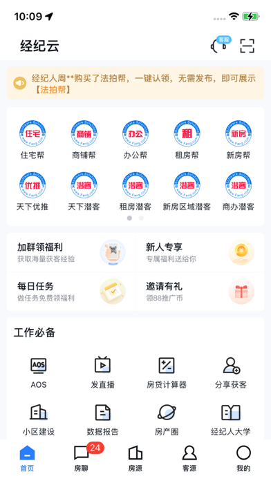 经纪云是房天下搭建的二手房经纪行业SaaS平台。汇聚住宅帮、天下潜客、天下优推等多款口碑产品,为经纪人匹配精准购房者;提供VR、直播、抖房等多种营销工具帮助经纪人扩建私域流量;提供房源管理、客源管理、数据管理、营销推广、交易流程管理等在内的一站式解决方案;构建操作便捷、管理智能、全效成交的全生态网络经纪服务平台。 主要产品介绍 1)住宅帮:为经纪人提供全业态的房源发布系统、全方位的大数据市场统计以及数据监控 。 2)天下潜客:基于对房天下近亿用户海量找房行为的智能分析,为经纪人精准匹配并推送符合其需求的客户。精准、智能地整合房天下房源、客源信息,提高经纪人与购房者的沟通效率,有效降低获客成本。 3)天下优推:房天下推出的精准营销的利器,优选推广占据前10黄金位置,凭借海量流量和优质找房用户,让推广得到更多的客户。按点击付费,性价比高。 4)租房帮:可推广租房房源,不限物业类型;一次推广,房天下网站三端展示,移动端优先展示;房源按照质量权重排列,高质量房源获得更高曝光率。修复已知问题。