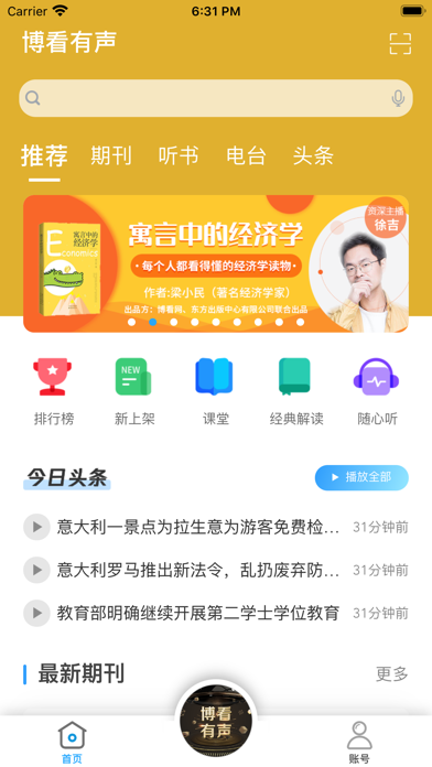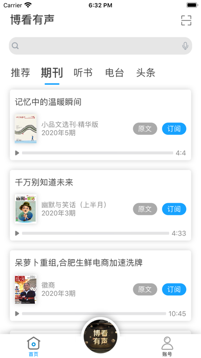 博看旗下移动有声产品,博看期刊姊妹版 博看拥有人文期刊4000多种,全国最大最全的人文期刊数据库;收录了国内发行的人文畅销期刊的95%以上; 同时拥有畅销图书,收录上榜好书、畅销新书接近20000本; 博看精选旗下的热门期刊和热门图书演播成“有声期刊”和“有声图书”,配合独立的偏好设置,让你拥有一个独一无二资源库,让你在看的同时,多一份选择,多一份热爱。 联系方式: 公众号:bookan_com 官方网站:http://www.bookan.com.cn 电话:027-83560588 地址:湖北省武汉市江汉区江旺路8号红T时尚创意街区5号楼3层支持灰色滤镜功能