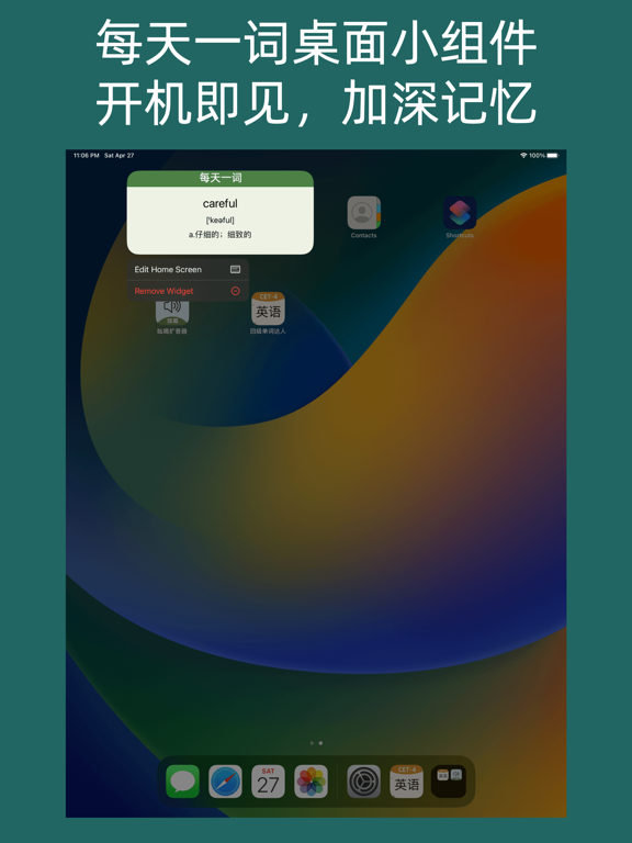 专注中考英语单词记忆,内含初中英语单词词汇。 这是一款针对中考英语词汇的简易背单词app,只需动动手指作出判断,背单词就象打卡一样简单,系统自动记录你的记忆情况,根据你的记忆情况作出学习计划,让你更轻松的掌握中考必背英语词汇。 主要功能: AI推荐智能出词 最新初中英语大纲词汇 widget小组件,每天一词开机即见 学习记录,单词掌握情况轻松查询和管理 本app无广告 每天一词小组件添加方法:长按手机桌面任意空白位置进入编辑状态,然后点击右上角加号,找到本app即可添加1、功能优化;
