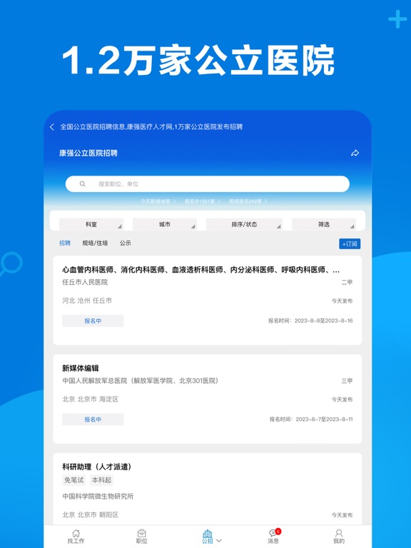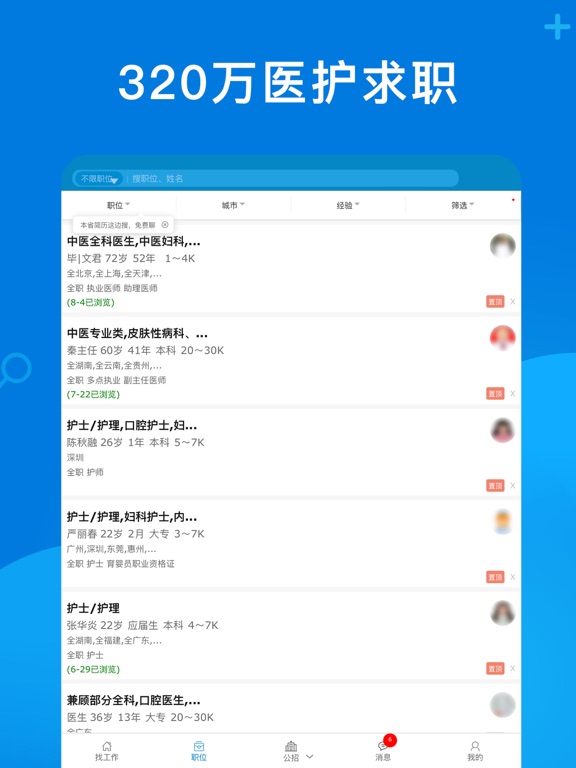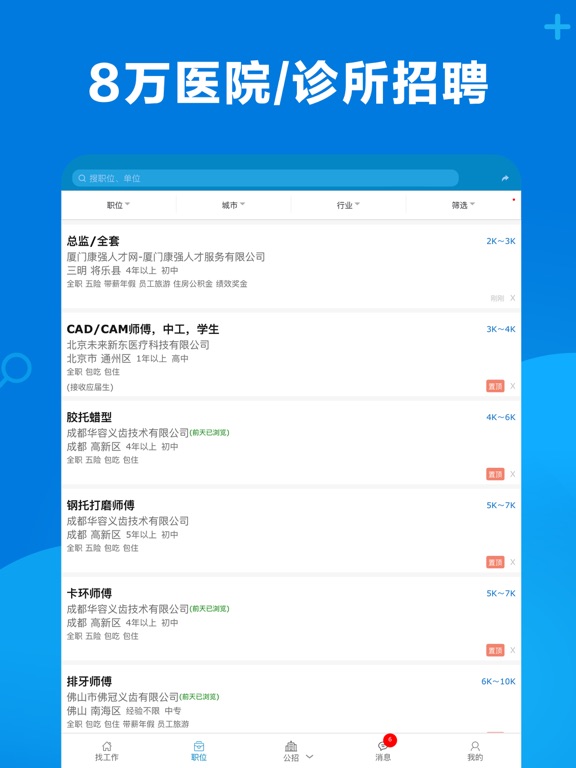 医护找工作上康强APP,入职就是快,免费发布招聘求职 10万家医院/门诊/药店招聘,320万医生/护士求职 招聘亮点: 1、全职、多点执业、在家兼职、坐班兼职、实习、飞刀、规培、合伙 2、公立招聘、全国医院/门诊、百强单位 3、悬赏招聘、招聘会、国际招聘、国际进修、工资查询、背景调查 康强门户栏目: 1、转让/加盟、医护找对象、办证公司、二手设备、医疗软件、医疗展会、医疗培训、 2、学历提升、设备维修公司汇总、装修公司汇总、等   招聘栏目有: 10万家单位提供医院招聘、门诊招聘、诊所招聘、养老院招聘、月子中心招聘、护士招聘、义齿招聘、药店招聘、医药公司招聘等。 求职栏目有: 医生求职,护士求职,牙医求职、医生多点执业、医生兼职、护士兼职,药师求职,义齿技工求职医护实习、在校生找实习等,目前共有320万医护,12万义齿技工,10万药师/营业员,还有大量行政、人事、销售、咨询师找工作 网站优势: 1万家公招时时发布,让您时时掌握全国单位信息。  单位介绍: 厦门康强人才服务有限公司前生为康强工作室成立于2006年,康强专注医护招聘18年。  康强使命:让1200万医疗人轻松找工作  客服电话:0592-5901237 客服微信:KQ36012  手机官网:M.KQ36.COM更新: 1、智能推荐 2、优化体验 3、BUG修复
