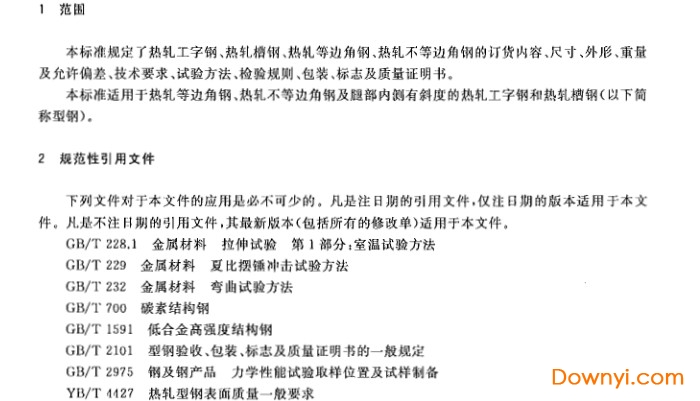 本标准规定了热轧工字钢、热轧槽钢、热轧等边角钢、热轧不等边角钢的订货内容、尺寸、外形、重量及允许偏差、技术要求、试验方法、检验规则、包装、标志及质量证明书,适用于热轧等边角钢、热轧不等边角钢及腿部内侧有斜度的热轧工字钢和热轧槽钢。