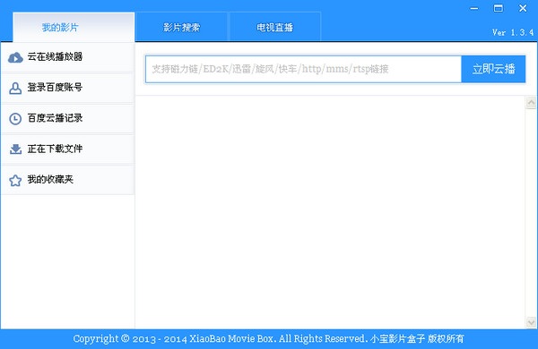 小宝影片盒子是一款方便易用的在线云播软件,一款好用的在线搜索影音播放工具,拥有我的影片、影片搜索、电视直播三大栏目,能够支持磁力链、ed2k、迅雷、旋风、快车等云播放。只需要搜索影音名称就能在线播放视频。云播放功能,指直接查看并在线播放离线空间视频文件的功能。核心技术是云下载与云转码。视频无需下载,即可在线快速播放。