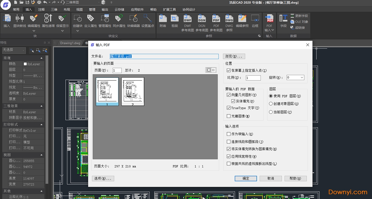 选择需要打开的pdf文件,对于多页文件,会自动识别导入pdf页数,可以选择输入哪页,确定在界面插入的位置,根据需要调整比例和旋转角度等。输入pdf数据选项框。默认“向量几何图形”“实体填充”“truetype文字”勾选,若不需要pdf 图形中的线条、填充、文字可以去除对应项的勾选。而“光栅图像”选项,是针对pdf中含有图片而勾选。