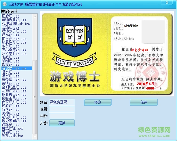 网络证件生成器是一款用来制作搞笑、整蛊的各种证件的图片制作工具,有光棍证、游戏达人证、恋爱证等各种趣味模板,简单操作快速方便,无论是表白还是恶搞都挺不错,快来下载吧!