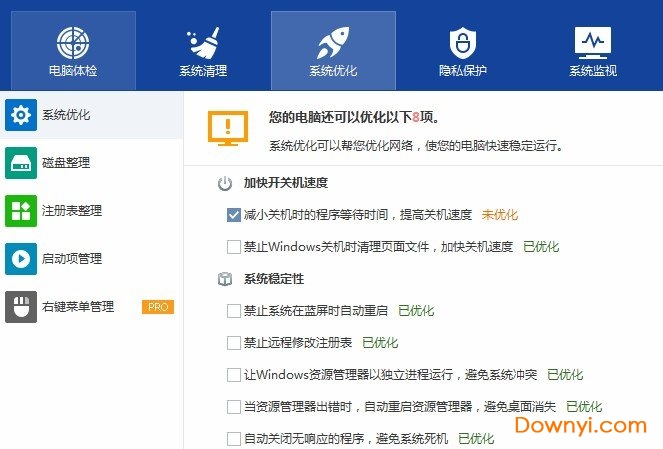 通过系统优化 、磁盘碎片整理、windows注册表整理和管理启动项里的进程与服务等对电脑进行全方面的优化。随着时间的推移,您的计算机的磁盘驱动器和注册表将变得混乱。